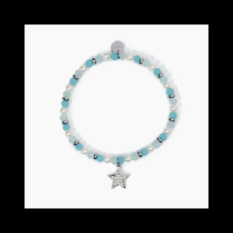 Bracciale elastico in acciaio 316L con perle conchiglia e color glass Ø 4 mm e pendente quadrifoglio 13×13 mm con cristalli bianchi Ø 1.25 mm, lunghezza 17 cm