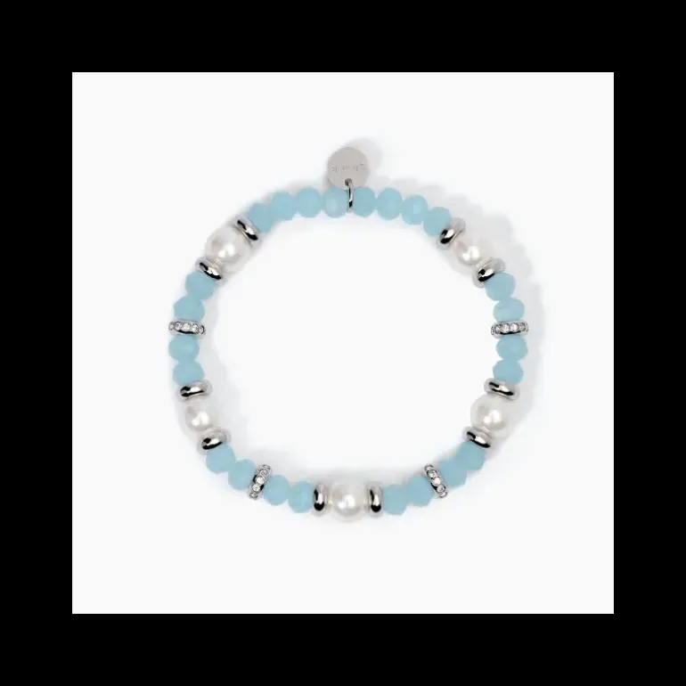 Bracciale elastico in acciaio 316L, con glass turchese Ø 6 mm, perle conchiglia Ø 8 mm e cristalli bianchi Ø 1.5 mm, lunghezza 18 cm
