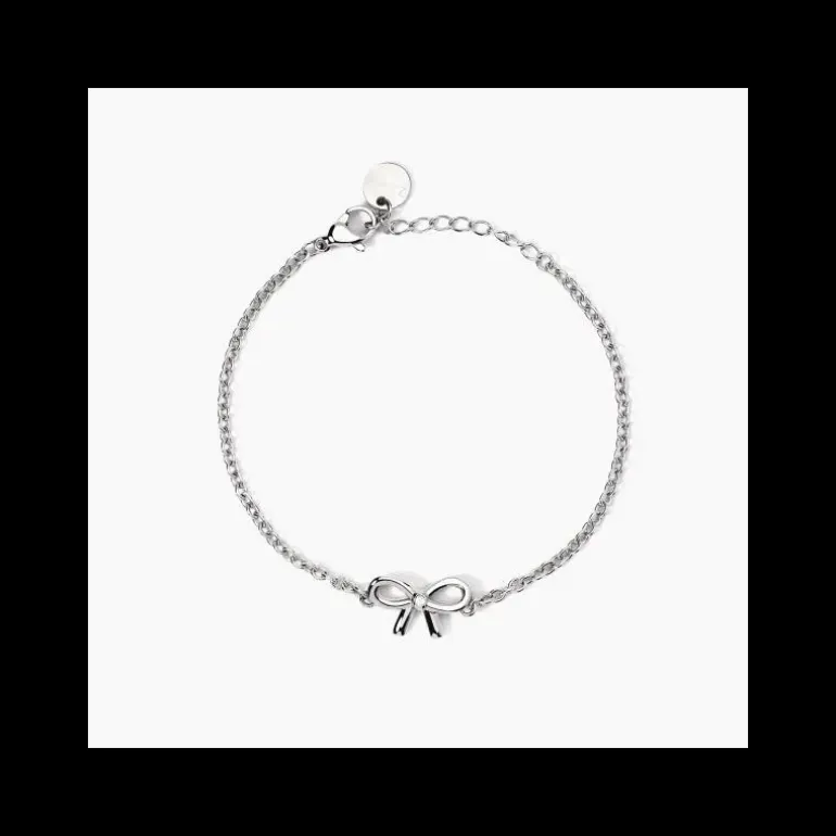 Bracciale in acciaio 316L con catena rolò 2 mm ed elemento fiocco centrale 15.5×9.5 mm con cristallo Ø 1.5 mm, lunghezza regolabile da 16 a 19 cm