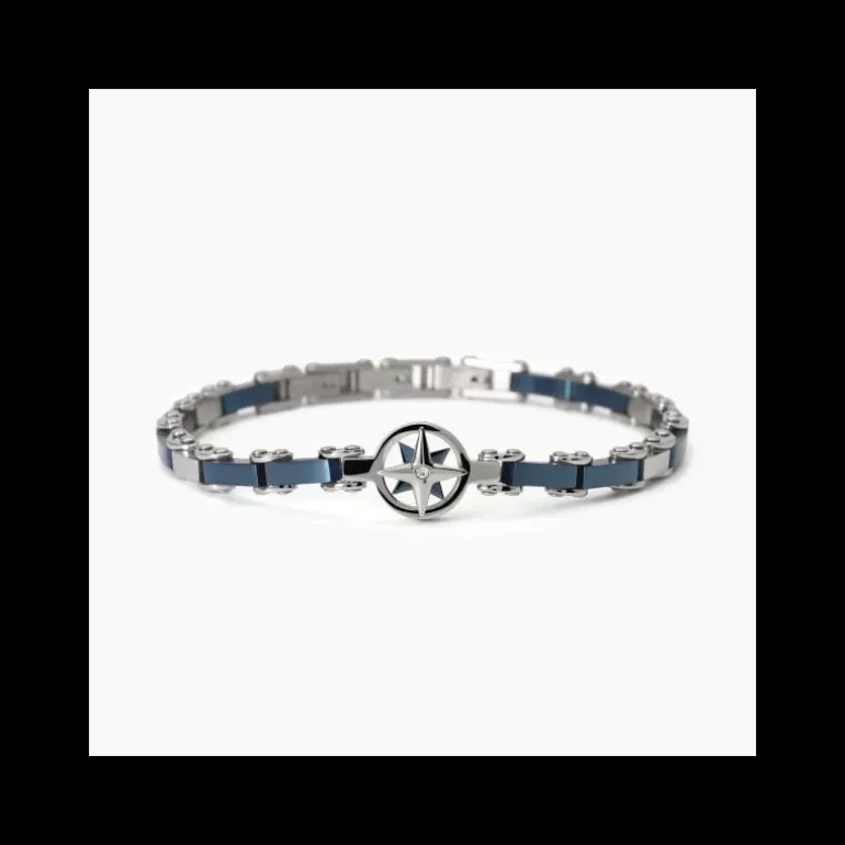 Bracciale in acciaio 316L lucido e satinato con maglie imperniate a elementi 7×3 mm a elementi in PVD blu 10×3 mm, elemento rosa dei venti lucido e con PVD blu 20×12 mm e cristallo Ø 1.5 mm, lunghezza regolabile da 19.5 a 21.5 cm