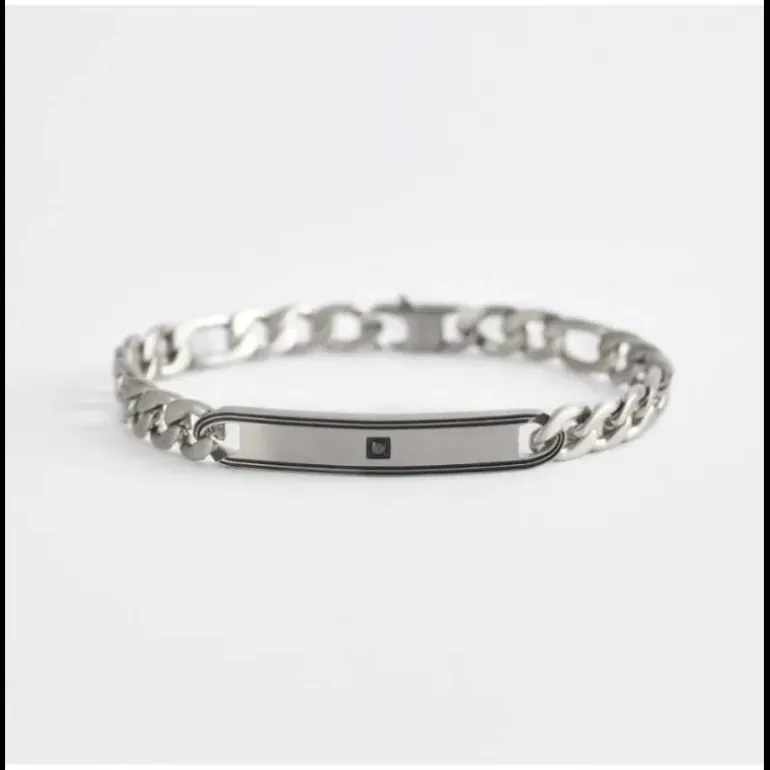 Braccialetto da uomo realizzato con catena in acciaio 316L dallo spessore di 7,40 mm. Targa centrale dalle dimensioni di 4,85 cm x 0,78 cm con zircone nero centrale. Lunghezza di 21 cm. Chiusura con moschettone.