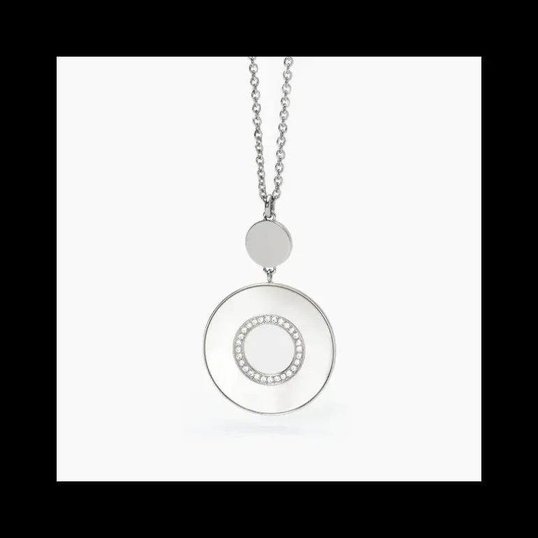 Girocollo in acciaio 316L con catena forzatina 2 mm, disco lucido Ø 10 mm, disco madreperla Ø 27 mm e cristalli Ø 1.25 mm, lunghezza regolabile da 40 a 45 cm