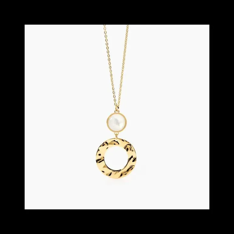 Girocollo in acciaio 316L e PVD giallo con catena forzatina 1.5 mm, elemento con perla conchiglia Ø 10 mm e pendente martellato Ø 24 mm, lunghezza regolabile da 40 a 45 cm