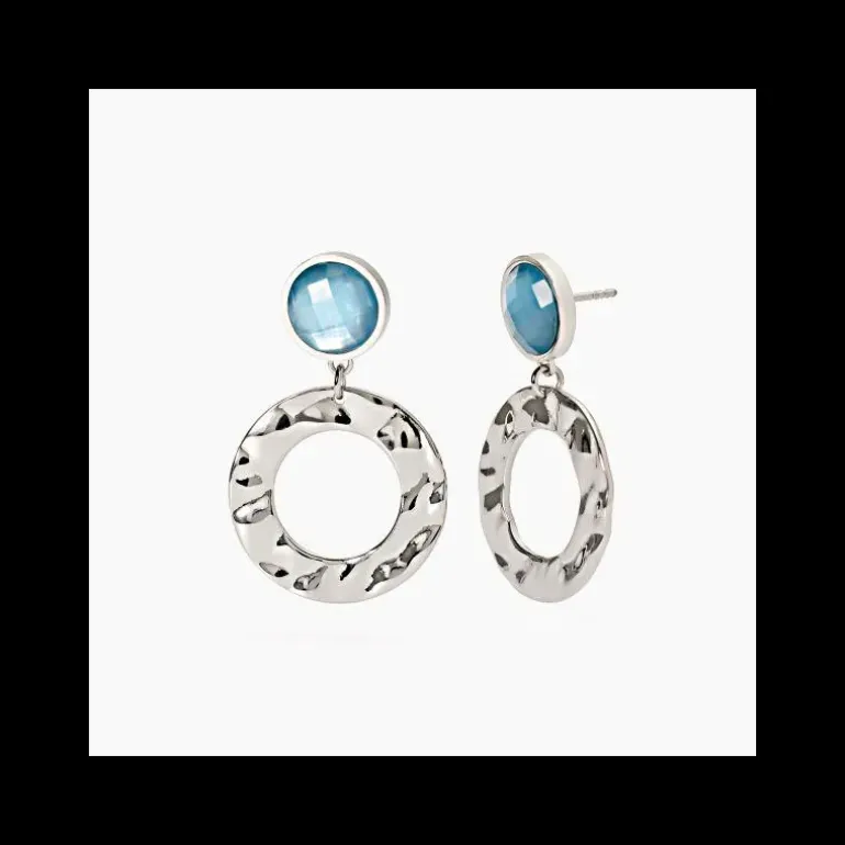 Orecchini in acciaio 316L con elementi in vetro azzurro e madreperla Ø 11.5 mm e pendenti martellati Ø 24 mm, lunghezza totale orecchino 3.8 cm