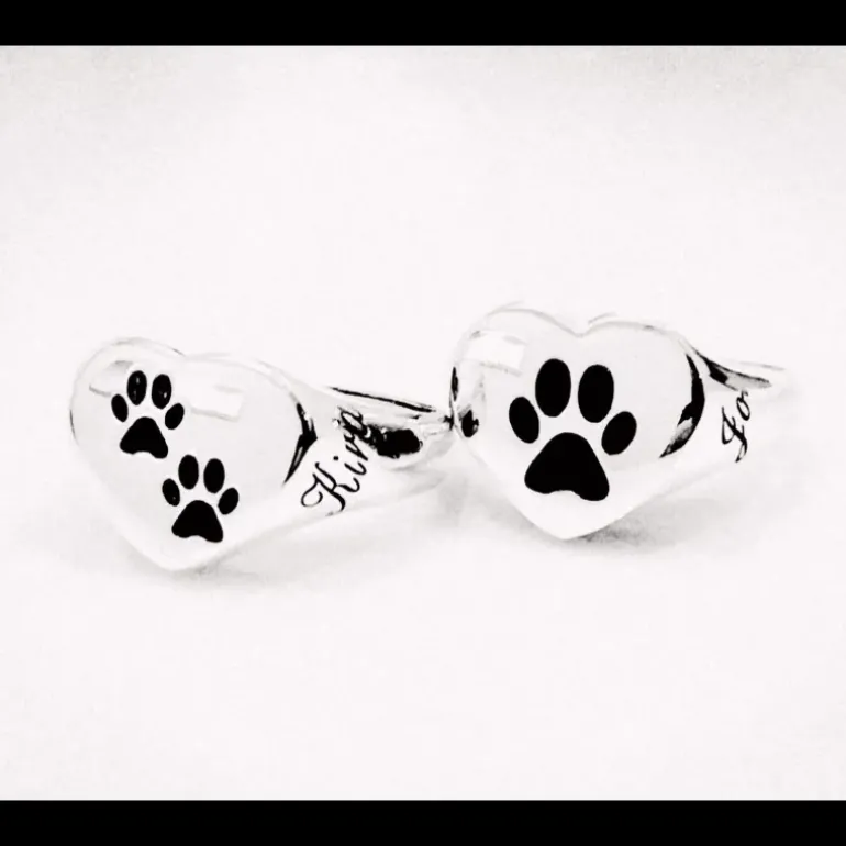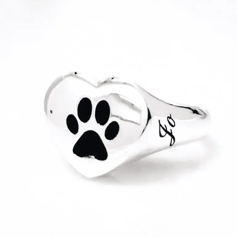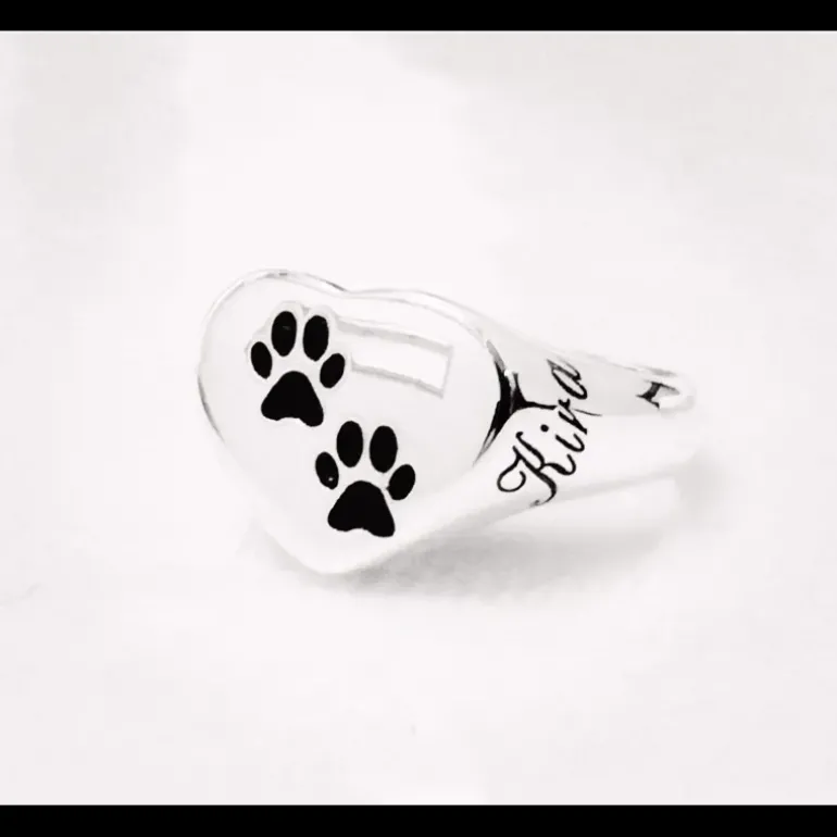 Anello chevalier a cuore con impronte zampetta di cane/gatto personalizzabile con nome – Peso 5 grammi, materiale, argento 925, l’ anello è a misura regolabile da mignolo – Prodotto forgiato dai nostri artigiani – Ci contatti per il nome da incidere .