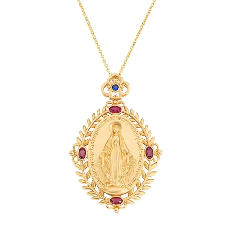 Amen – Collana Medaglia Miracolosa Dorata con Zirconi Bianchi, Rossi e Blu