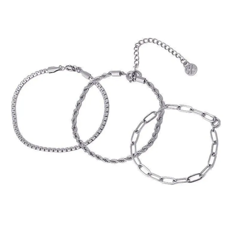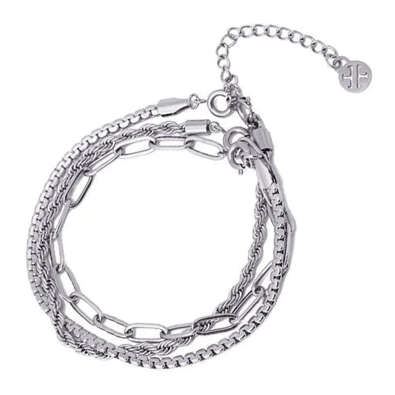 Bracciale a tre strati con maglie e cordini assortiti. Puoi rimuovere e mettere ciascuno degli strati in modo da indossare ogni giorno un nuovo braccialetto o metterli tutti insieme per formare una collana molto originale. Fantastica da abbinare ad anelli semplici e look urban. È realizzato in acciaio placcato oro, impermeabile e anallergico.