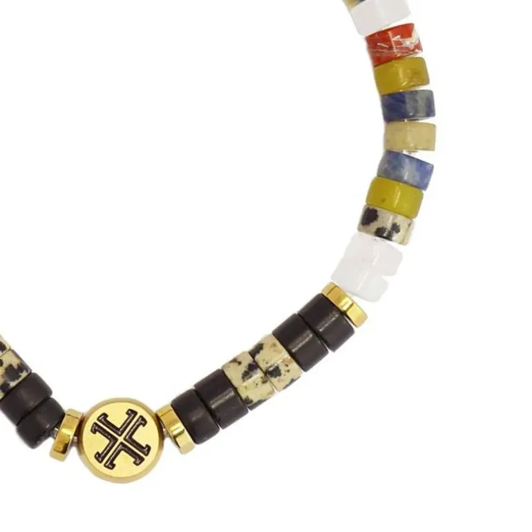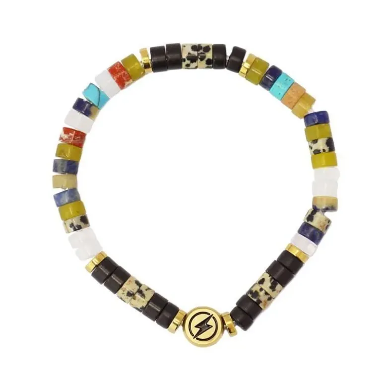 Bracciale elastico da uomo formato da perline cilindriche (6 mm) di pietra naturale colorate nei toni dell’autunno. Presenta un dettaglio centrale circolare reversibile in acciaio chirurgico, da un lato è inciso un fulmine e dall’altro il logo anartxy. È un all-terrain che puoi indossare ogni giorno con look casual. Molto comodo e versatile. Il regalo perfetto per uomini determinati.