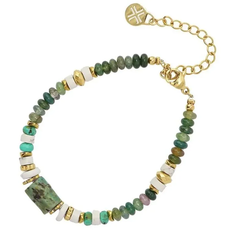 Bracciale in acciaio chirurgico anallergico color oro con perline realizzate artigianalmente in pietra naturale colorata nei toni del verde. Di grande qualità e bellezza, dona ai tuoi look un tocco bohémien ideale. Misura 15 cm di lunghezza e ha una catena extra di 5 cm e chiusura a moschettone. Prezioso!