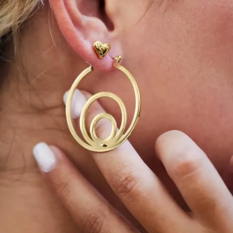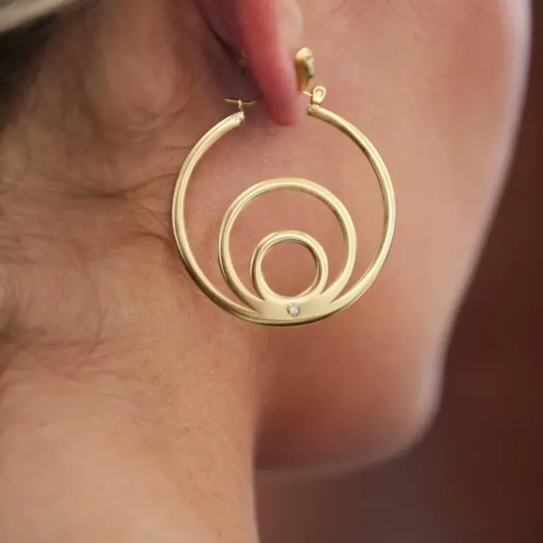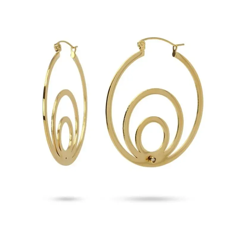 Cerchi piatti con disegno a tre cerchi e dettaglio in zirconi. Un capo classico, femminile ed elegante da indossare con look semplici e di classe. Sono realizzati in acciaio chirurgico, non provocano allergie e non arrugginiscono. Hanno una chiusura di tipo catalano che le rende molto comode e pratiche da indossare e da togliere. Misurano 40 mm di diametro.