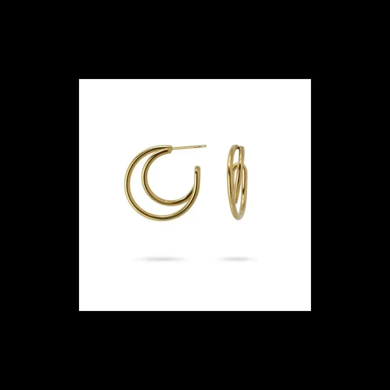 Orecchini a cerchio formati da un’unica linea che si incurva a formare due anelli di dimensioni diverse. Indossati sembrano due orecchini separati. Disponibili in oro o argento, sono un’opzione originale ed elegante da indossare giorno e notte. Misurano 25 mm e hanno un perno con chiusura a pressione a farfalla. Sono realizzati in acciaio chirurgico, quindi non provocano allergie e possono bagnarsi.