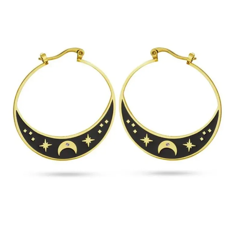 Orecchini piatti ispirati alla luna smaltati di nero con mini dettagli a forma di luna e stelle abbinati a zirconi. Lusinghieri con i capelli sciolti o legati, con look casual o da sera, sono molto versatili e comodi. Sono realizzati in acciaio chirurgico anallergico in oro o argento. Misurano 40 di diametro e hanno una chiusura di tipo catalano.