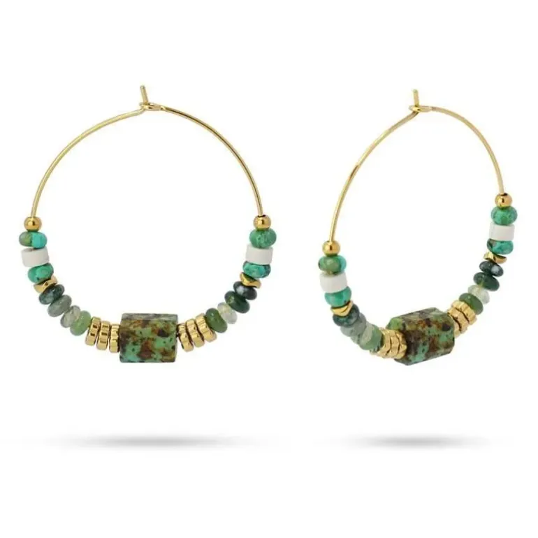 Orecchini a cerchio in acciaio chirurgico anallergico color oro con perline in pietra naturale color verde fatte a mano. Con un’ispirazione naturale e bohémien, prediligono in pieno le bionde, le brune e le rosse. Abbinalo alla collana e al braccialetto abbinati. Misurano 40 mm di diametro.