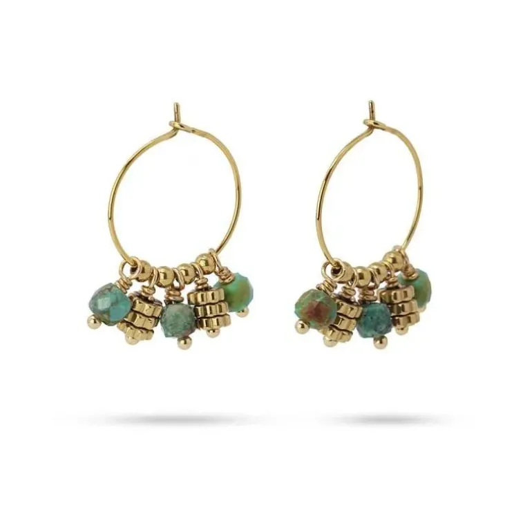 Orecchini a cerchio in acciaio chirurgico con perline in pietra naturale dai colori vivaci. Realizzati artigianalmente, sono cerchi con movimento, che portano luce e vitalità ai tuoi look. Disponibile collana e bracciale abbinati. Misurano 20 mm di diametro. Ideali!