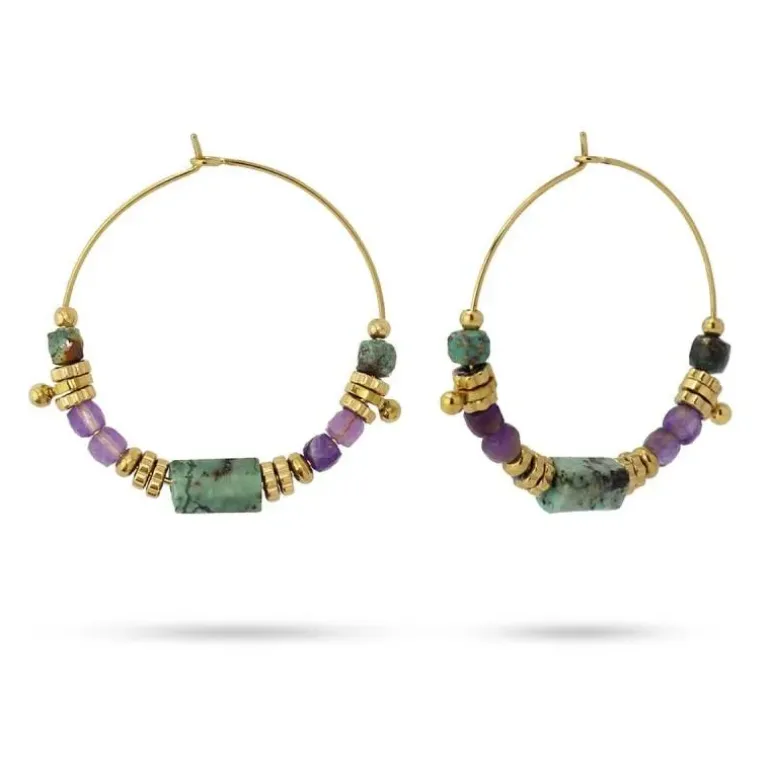 Orecchini in acciaio chirurgico anallergico color oro con perline in pietra naturale colorata da 5 mm, realizzati a mano. Disponibili in due tonalità alla moda, sono di ispirazione bohémien e molto lusinghiere. Misurano 40 mm di diametro. Disponibile bracciale e collana abbinati.