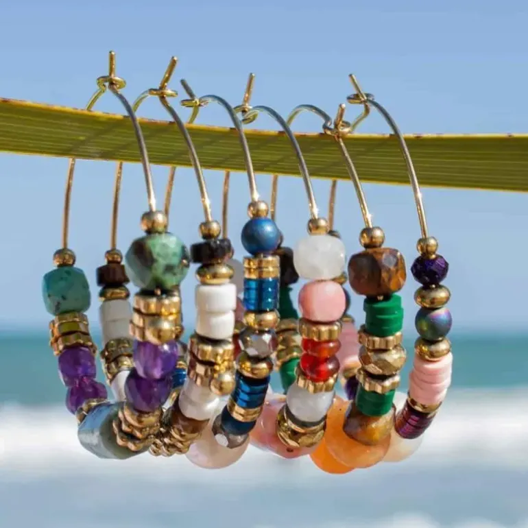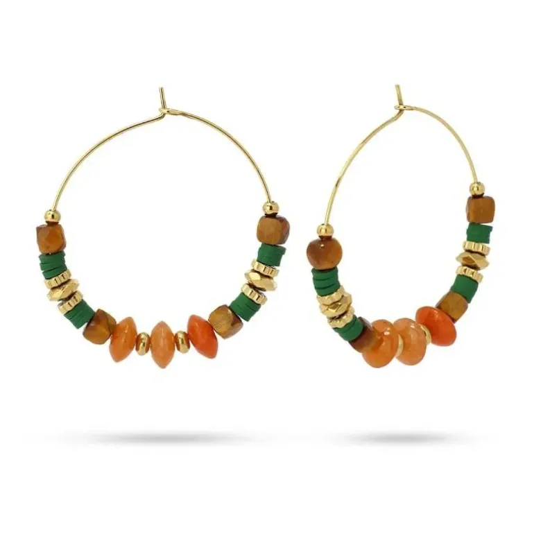 Orecchini in acciaio chirurgico anallergico color oro con perline da 5 mm in diverse forme e materiali, come pietra naturale colorata e dischi in gomma tipo heishi. Orecchini dai colori autunnali e di ispirazione etnica perfetti da indossare ogni giorno. Misurano 40 mm di diametro. Disponibile bracciale e collana abbinati.