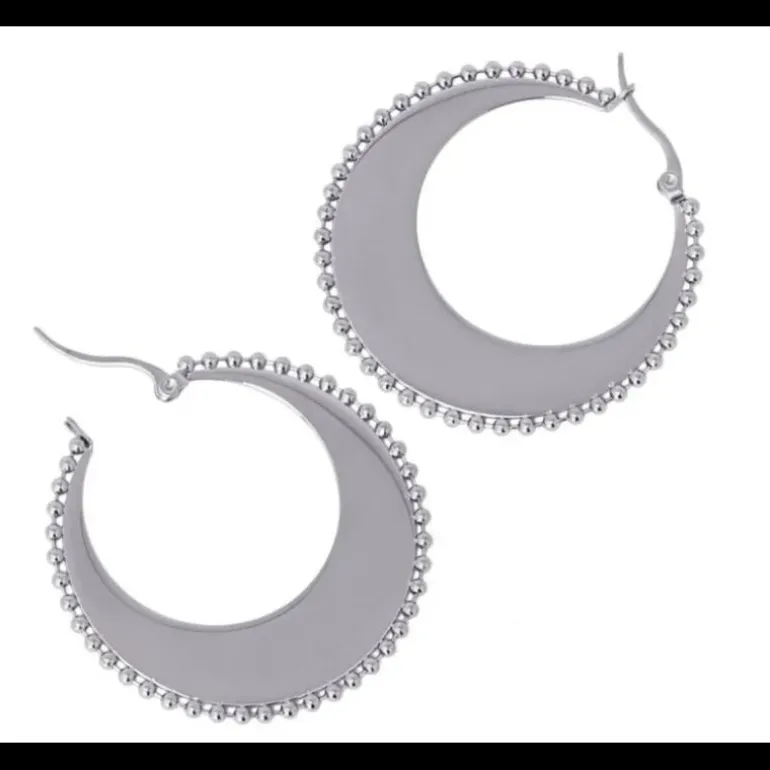 Orecchini a cerchio piatti con dettaglio pallina sul perimetro. Sono realizzati in acciaio chirurgico anallergico in oro o argento. Di chiara ispirazione gitana, sono perfetti da indossare con abiti rilassati. Sono molto comodi da indossare e da togliere grazie alla loro chiusura di tipo catalano. Misurano 42 mm di diametro.