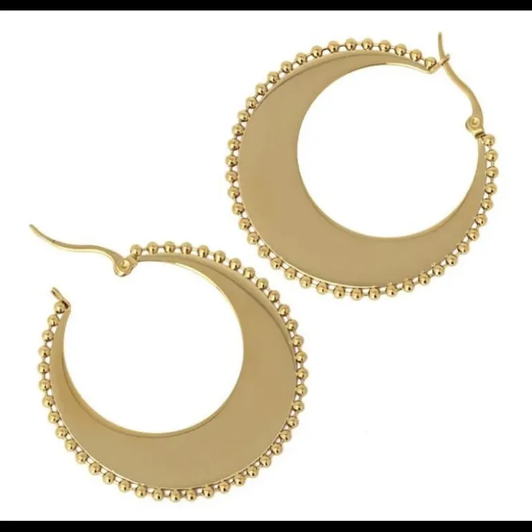 Orecchini a cerchio piatti con dettaglio pallina sul perimetro. Sono realizzati in acciaio chirurgico anallergico in oro o argento. Di chiara ispirazione gitana, sono perfetti da indossare con abiti rilassati. Sono molto comodi da indossare e da togliere grazie alla loro chiusura di tipo catalano. Misurano 42 mm di diametro.