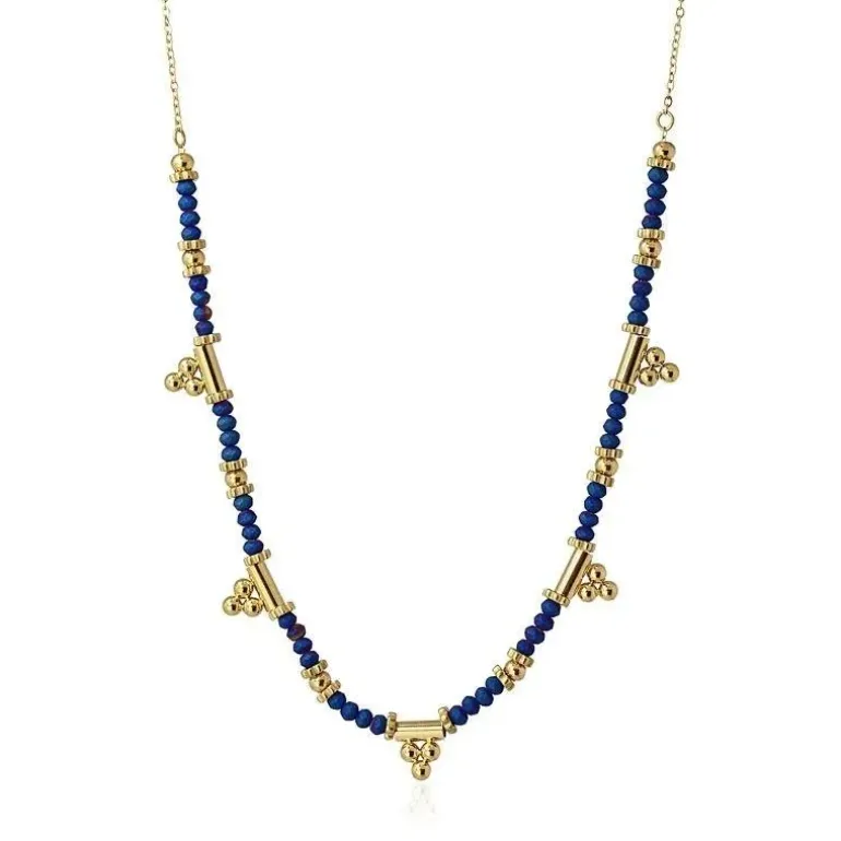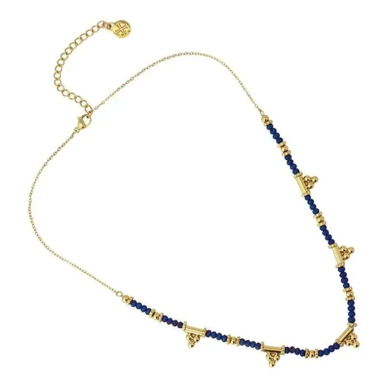 Collana composta da mini perle di vetro colorate e blocchi in acciaio chirurgico placcato oro con design a sfera. Un capo di ispirazione etnica dai colori accesi che può essere abbinato a look casual o da spiaggia. Non provoca allergie e può bagnarsi. Quattro colori tra cui scegliere. Misura 38 cm di lunghezza e ha una catena di prolunga di 5 cm con il logo anartxy per regolarla in base al tipo di scollo che indossi.