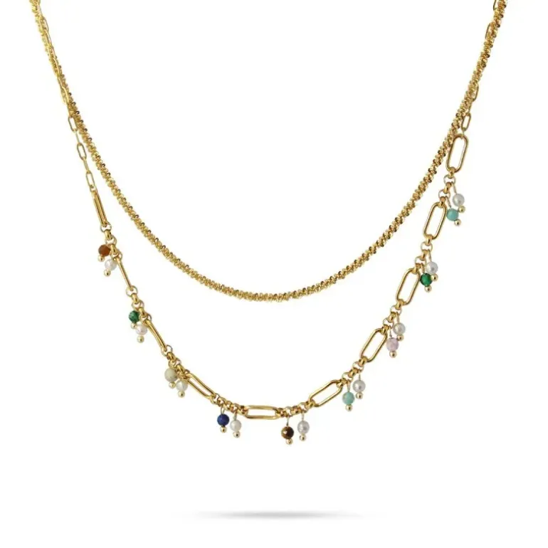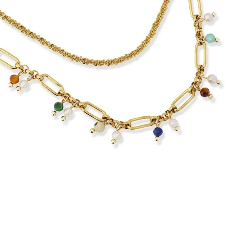 Collana a due strati in acciaio chirurgico e piccole perline di pietre naturali colorate e perle d’acqua dolce. Dona un tocco romantico ai tuoi look senza tralasciare comfort e versatilità. Puoi abbinarlo ad altre catene dorate a cascata o al suo bracciale abbinato. La catena esterna misura 40 cm, quella interna 35 cm e ha una prolunga extra di 5 cm e chiusura a moschettone per regolarla.