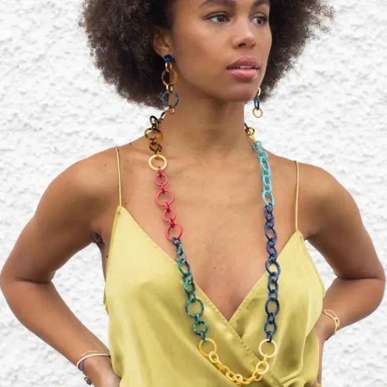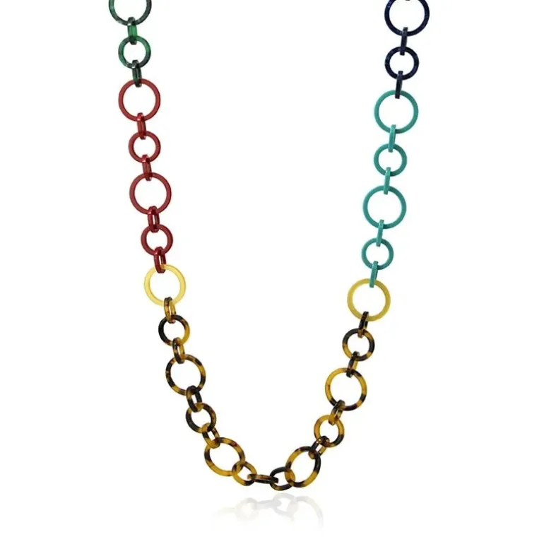 DETTAGLI DEL PRODOTTO Materiale aggiunto Resina Catena 90 cm DESCRIZIONE Collana lunga con maglie multicolori e texture tartarugata.
