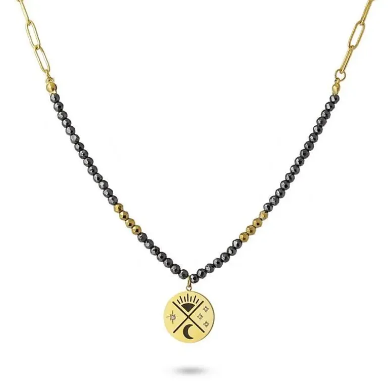 Collana formata da una catena di maglie e perline di ematite con pendente tondo con dettagli giorno e notte con zirconi. Bello e significativo, sarà il tuo amuleto da indossare ogni giorno. Abbinalo a tutti i tipi di indumenti. È realizzato in acciaio chirurgico ipoallergenico in oro o argento. La catena misura 38 cm e ha un’estensione extra di 5 cm. Il ciondolo misura 15 mm.