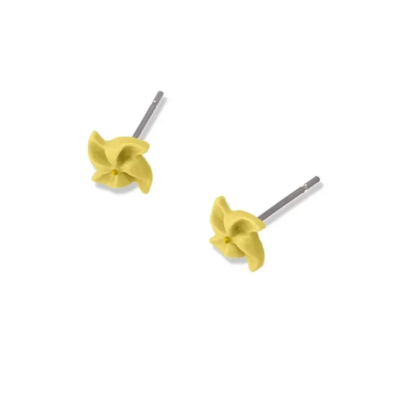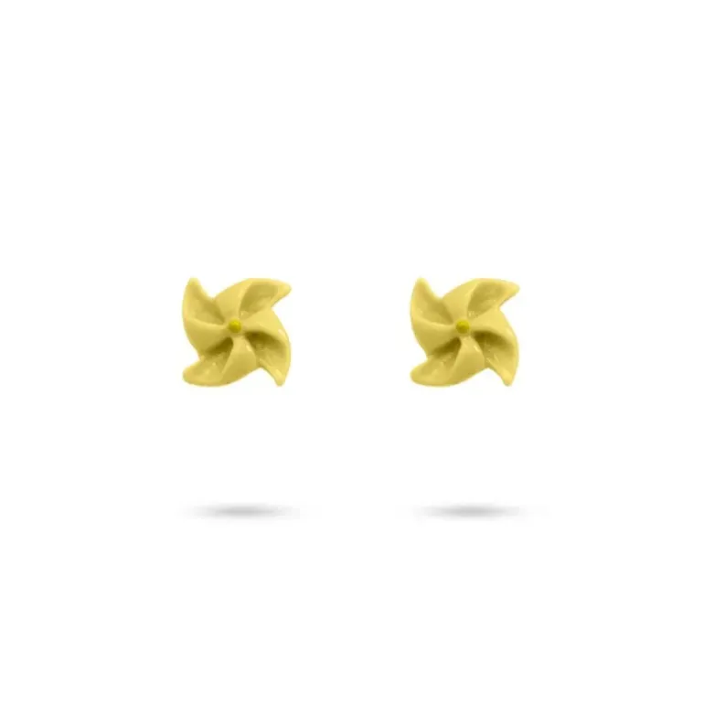 Piccoli orecchini a forma di girandola in ceramica smaltata. Ispirati dall’infanzia, sono disponibili in verde, giallo o rosa. Sono ideali da indossare tutti i giorni e danno un tocco di colore e allegria ai tuoi outfit. La chiusura è in acciaio chirurgico anallergico. Misurano 6 mm. Dettagli del prodotto Materiale aggiunto Ceramica Smalto Dimensioni 6 mm Materiale Acciaio chirurgico Riferimento CPE110AA