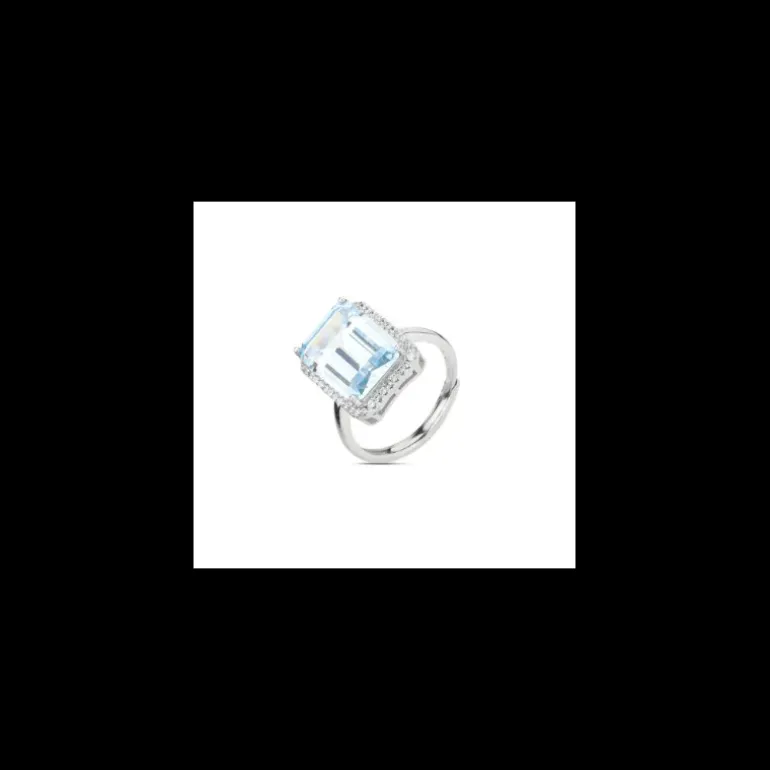 Anello rodiato con centrale rettangolare di colore acquamarina circondato da zirconi bianchi.