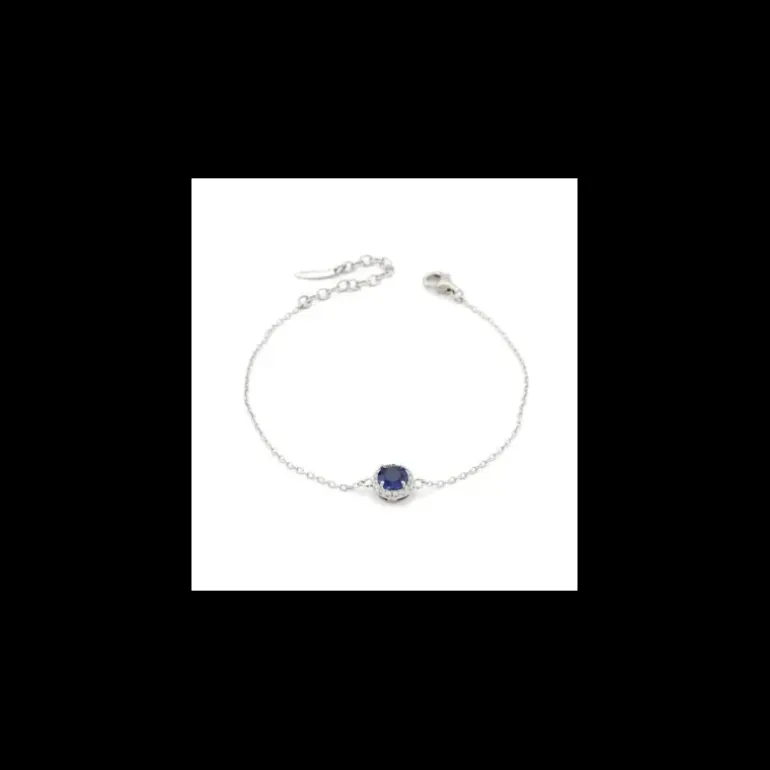 Bracciale rodiato con cristallo centrale di colore blu circondato da zirconi bianchi.