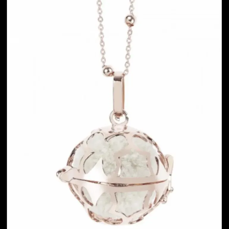 Collana in bronzo placcato oro rosa con pendente apribile ( diametro cm 2,4) e batuffolo rosa da profumare con la propria fragranza.Lunghezza cm 80. La confezione comprende altre 5 colorazioni del batuffolo.