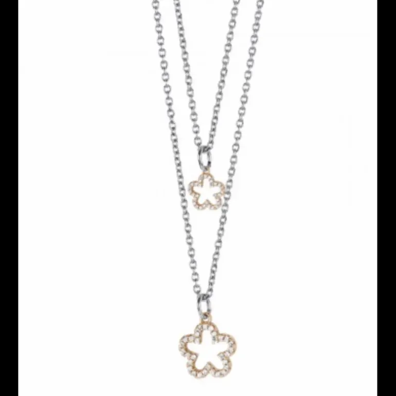 Collana doppio filo degradè in acciaio con fiori pendenti in bronzo placcati oro rosa dal profilo di zirconi. Lunghezza filo più corto cm 38; lunghezza filo più lungo cm 43 e allungamento di cm 5,5.