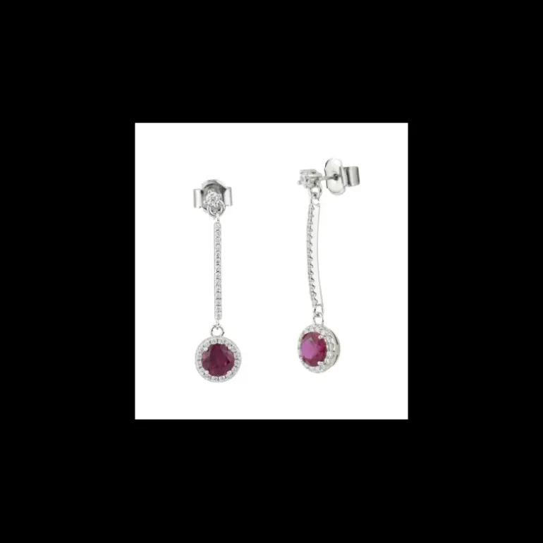 Orecchini rodiati con cristallo pendente di colore rubino e fila lunga di zirconi bianchi.