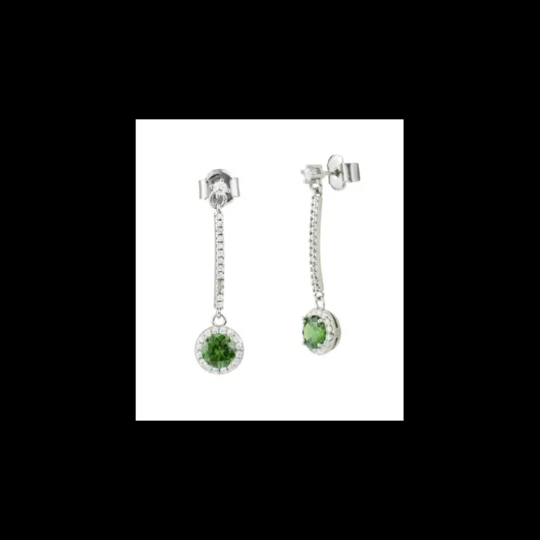 Orecchini rodiati con cristallo pendente di colore verde e fila lunga di zirconi bianchi.