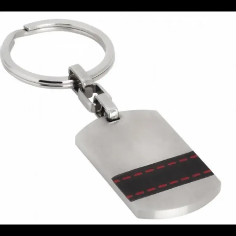 Portachiavi con elemento decorativo trasversale in Pvd nero e rosso. Materiale: acciaio 316L Misure: lunghezza cm 8,5, larghezza piastrina cm 2,5