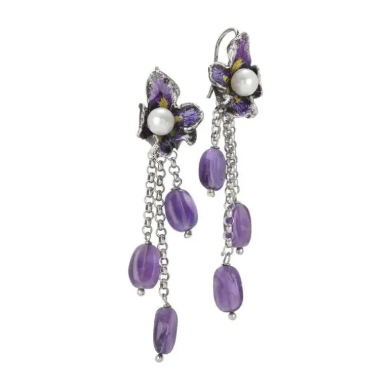 Bottega Boccadamo – Orecchini Con Fiore Di Iris, Perle Naturali E Cristalli Ametista