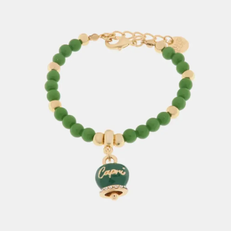 Bracciale in Metallo Con campanella portafotuna Capri MADE IN P.R.C.. Materiali: Metallo Base, Pietra: smalto e cristalli, Galvanica: Placcato Oro, Varianti o Misura: 17+3Cm., Colore: VERDE. Forma: CAMPANELLA.