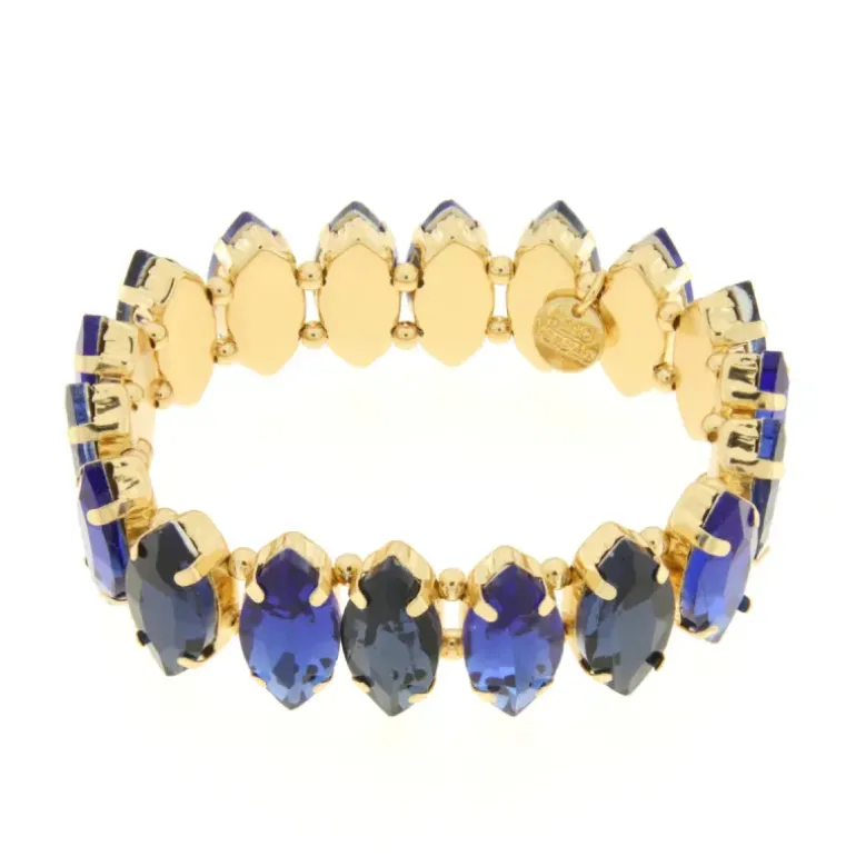 Bracciale in Metallo con cristalli nelle sfumature del blu Made in P.R.C.. Materiali: Metallo Base, Pietra: pietre sint., Galvanica: Placcato Oro, Varianti o Misura: REGOLABILE ELAST, Colore: BLU. Forma: N.D..