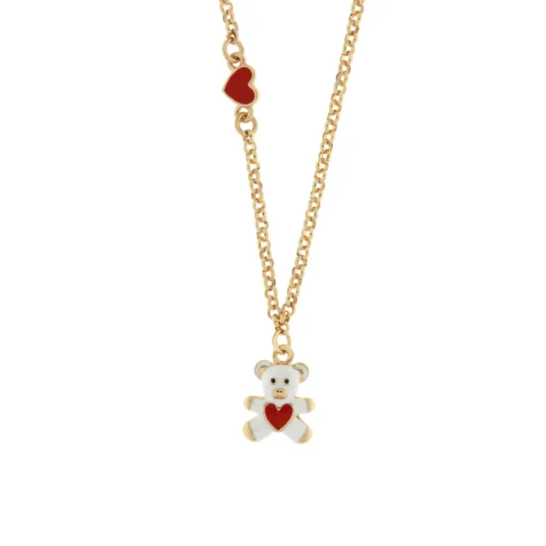 Collana in Metallo Made in P.R.C.. Materiali: Metallo Base, Pietra: smalto e cristalli, Galvanica: Placcato Oro, Varianti o Misura: 40+5CM, Colore: BIANCO. Forma: ORSO CUORE.