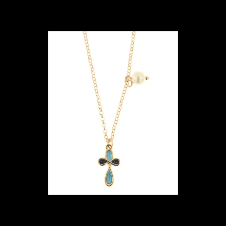 Collana in Metallo con pendente a forma di croce smaltato blu e nero con dettaglio in perla Collana in Metallo – 3540953 Materiali: Metallo Base Pietra: Smalto e cristalli Galvanica: GOLD Varianti o Misura: 60+5CM Colore: 8MM PEARL X174#+X142#BLUE
