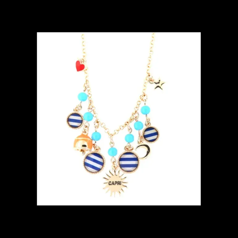 Collana in Metallo in stile marino, con sole scritta Capri, campanella e luna Made in P.R.C.. Materiali: Metallo Base, Pietra: Smalto e cristalli, Galvanica: Placcato Oro, Varianti o Misura: cm. 45+5, Colore: BLU. Forma: MARE.