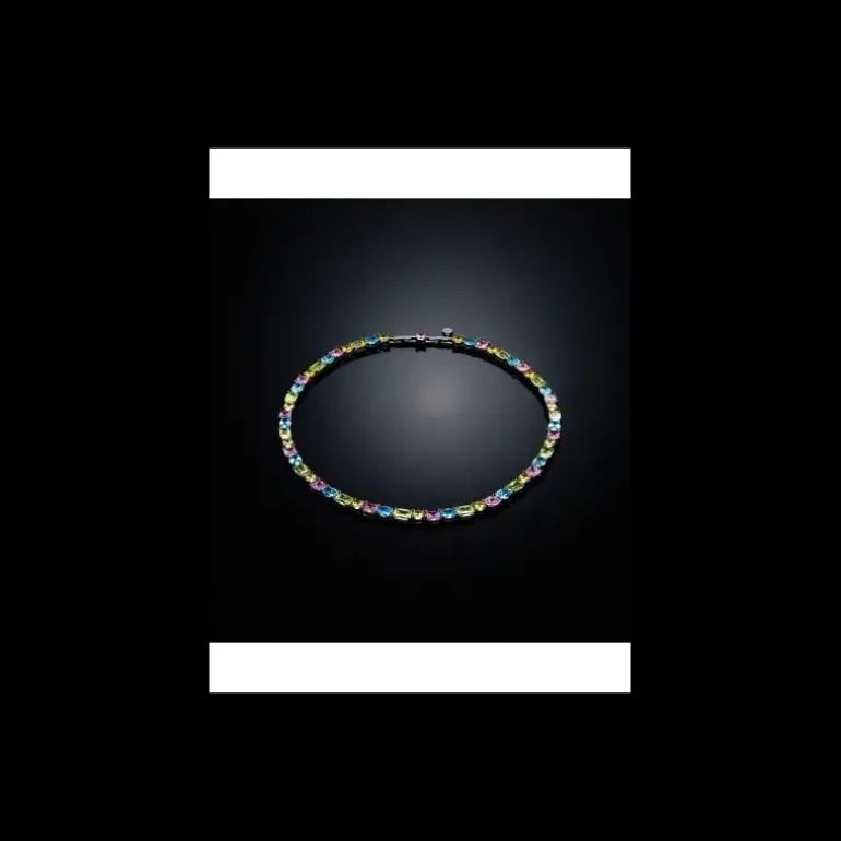 Girocollo con zirconi multicolor nei toni del blu, giallo, rosa e verde, placcati in rodio. Le pietre sono caratterizzate da diversi tagli: rotondo, quadrato, ovale e smeraldo. Lunghezza: 40 cm