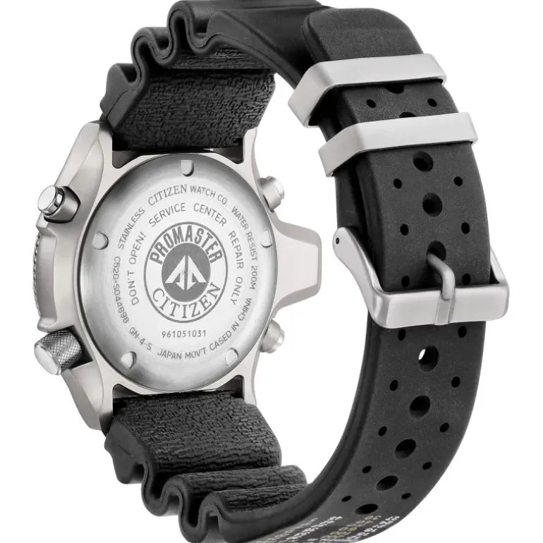 Diver’s professionale certificato ISO 6425 Movimento Al quarzo, cal. C520, analogico-digitale con sensore. Funzioni Orario (ore, minuti e secondi, AM/PM), calendario completo, suoneria, cronografo a 1/100 di sec., con rilevazione tempi parziali. Rilevazione dati di immersione e relativa memorizzazione. Allarmi di immersione. Controllo carica batteria. Sensore di profondità. Caratteristiche Cassa in acciaio, cinturino in morbido poliuretano. Indici e sfere ad alta visibilità. Fondo e corona serrati a vite. Ghiera girevole unidirezionale zigrinata. Vetro minerale. WR 20 bar. Dati di immersione rilevanti Mese e giorno di immersione, numero immersioni (da 1 a 4). Profondità massima raggiunta (da 1 a 80 mt) con incrementi di 10 cm. Durata immersione. Orario inizio immersione (ora, minuti), orario di fine immersione (ora, minuti). Tutti i dati sono memorizzati e quelli relativi alle ultime 4 immersioni possono essere richiamati. Allarmi di immersione Allarme di profondità, allarme di durata dell`immersione, allarme di risalita rapida, allarme di profondità anormale. Avvertenza batteria scarica. Funzione di controllo della suoneria di immersione. Dimensioni Diametro cassa 44 mm
