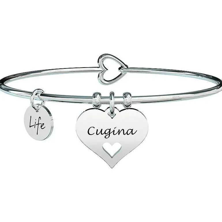 Più di un’amica, come una sorella. Ti voglio bene. Cugina Bangle in acciaio con ciondolo a cuore. • Incisione smaltata sul ciondolo • Chiusura a cuore • Misura unica, diametro 6 cm • Materiale: Acciaio 316L • Designed by Kidult in Italy