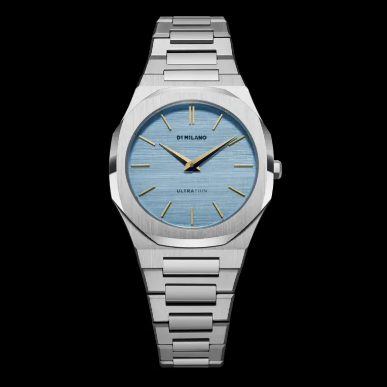 Dimensione della Cassa 34.0mm x 6.20mm Materiale della Cassa Acciaio Inossidabile 316L, Spazzolato e Lucidato Cinturino Acciaio Inossidabile Argento Chiusura Chiusura Hidden Butterfly Lunetta Acciaio Inossidabile Argento Fondello Acciaio Inossidabile Argento Quadrante Azzurro con texture in lino Lancette & Indici Ottone con placcatura in oro IP Vetro Zaffiro, finitura antiriflesso Movimento Citizen Miyota 1L22, Quarzo Resistenza all’Acqua & Peso 5ATM,55g SKU code D1-UTBL17