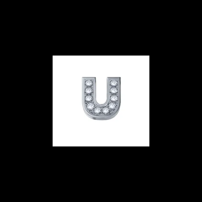 Elemento lettera “U” mm 5×6 in oro bianco 18kt (750 millesimi) dal peso di grammi 0,8 (circa) con diamanti taglio brillante incastrati in pavè dal peso di kt 0.02. L’elemento si inserisce nel bracciale Elements-Donnaoro sia morbido che rigido.