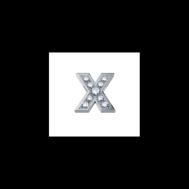 Elemento lettera “ X ” mm 5×6 in oro bianco 18kt (750 millesimi) dal peso di grammi 0,8 (circa) con diamanti taglio brillante incastrati in pavè dal peso di kt 0.02. L’elemento si inserisce nel bracciale Elements-Donnaoro sia morbido che rigido.