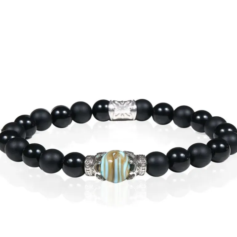 Il bracciale Gerba LAB 033 si distingue per il suo particolare design, realizzato a mano con filo elastico, perle in pietra 8mm Onice, impreziosito da perla in murrina 10mm e componenti in Metallo anallergico.