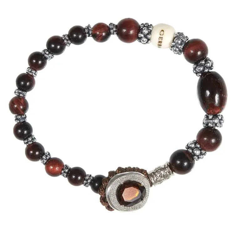 Il bracciale Gerba LAB 118 si distingue per il suo particolare design, realizzato con cordino in filo cerato, perle in pietra 6/8mm Occhio di Tigre Rosso, impreziosito da chiusura in bottone con pietra e componenti in Metallo anallergico.