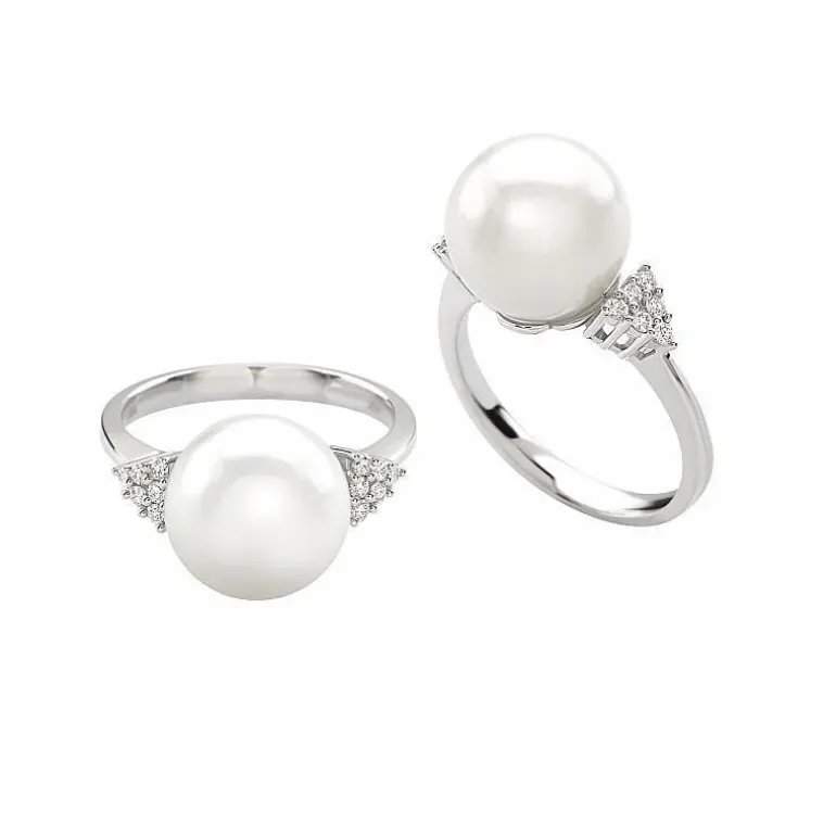 Anello in oro bianco con perla centrale di 11 mm e diamanti taglio brillante ai lati di 0.08ct.