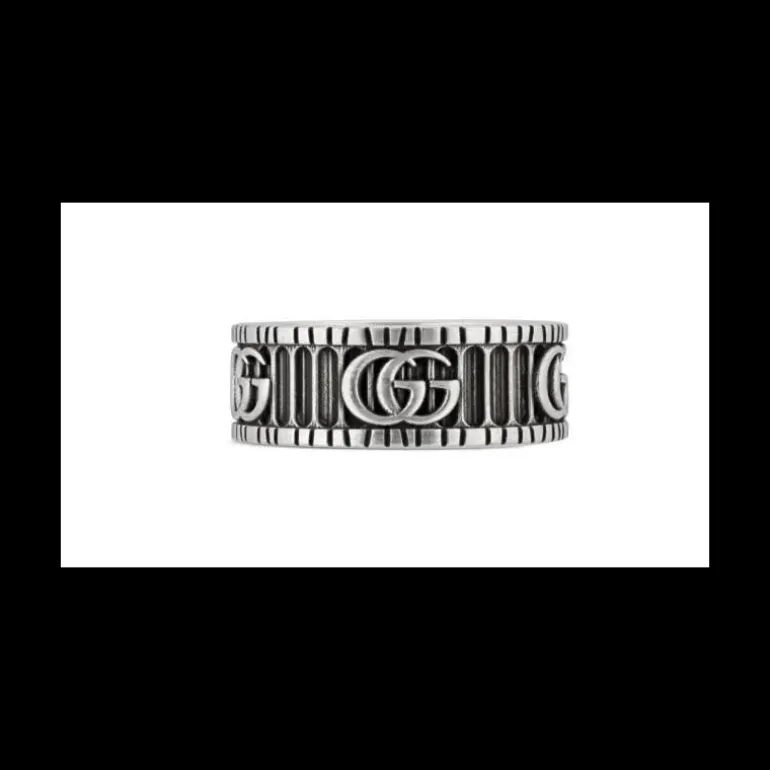 Rivisitazione contemporanea di un dettaglio degli anni ’70, in questa nuova linea di gioielli in argento la Doppia G si combina a elaborate incisioni. A contrasto con pattern tridimensionale a righe che crea un effetto bicolore, il logo definisce questo anello a fascia. Argento 925 bicolore con finiture anticate Doppia G tridimensionale con motivo a righe 8mm La collezione di gioielli Gucci è realizzata con materiali ipoallergenici e privi di nichel.
